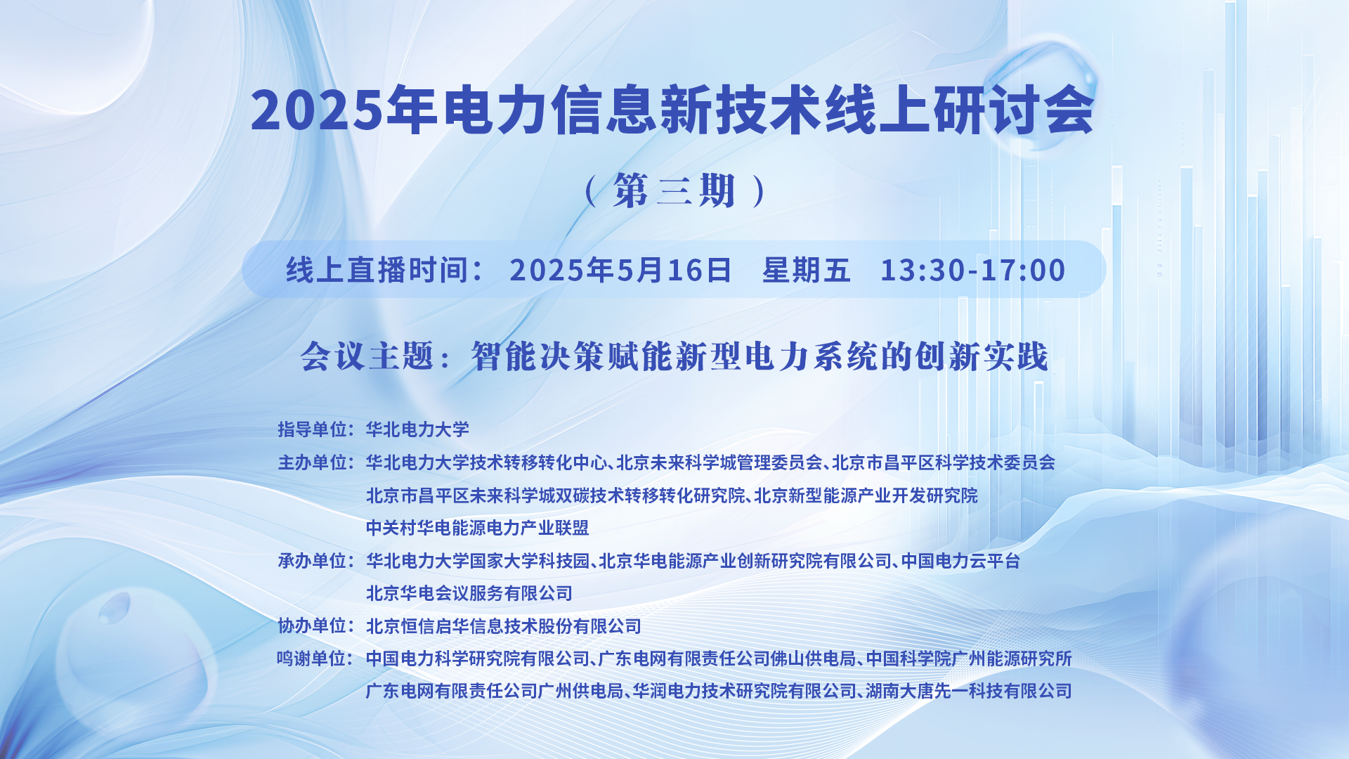 2025年电力信息新技术线上研讨会(第三期)一、讲座主题:智能决策赋能新型电力系统的创新实践 二、讲座时间:2025年5月16日 星期五 13:30-17:00 三、讲座地点:线上直播:https://t19c5.xetlk.com/sl/1KZA7r(联系人李老师 18911662193) 四、主讲人信息: (一)主讲人:李亚平 ...主讲人:李亚平、齐丹、邱桂华、王同贺、孔令明、彭喆、马桂英时间:2025-05-16 13:30地点:线上讲座