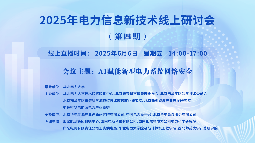 2025年电力信息新技术线上研讨会(第四期)一、讲座主题:AI赋能新型电力系统网络安全 二、讲座时间:2025年6月6日 星期五 14:00-17:00 三、讲座地点:线上直播:https://t19c5.xetlk.com/sl/3J08JD(联系人:雷捷婷15301327986) 四、主讲人信息: (一)主讲人:丁志成 国家能源集团数据中心...主讲人:丁志成、彭天齐、张昊、林裕新、李建彬、杨小东时间:2025-06-06 14:00地点:线上讲座 -