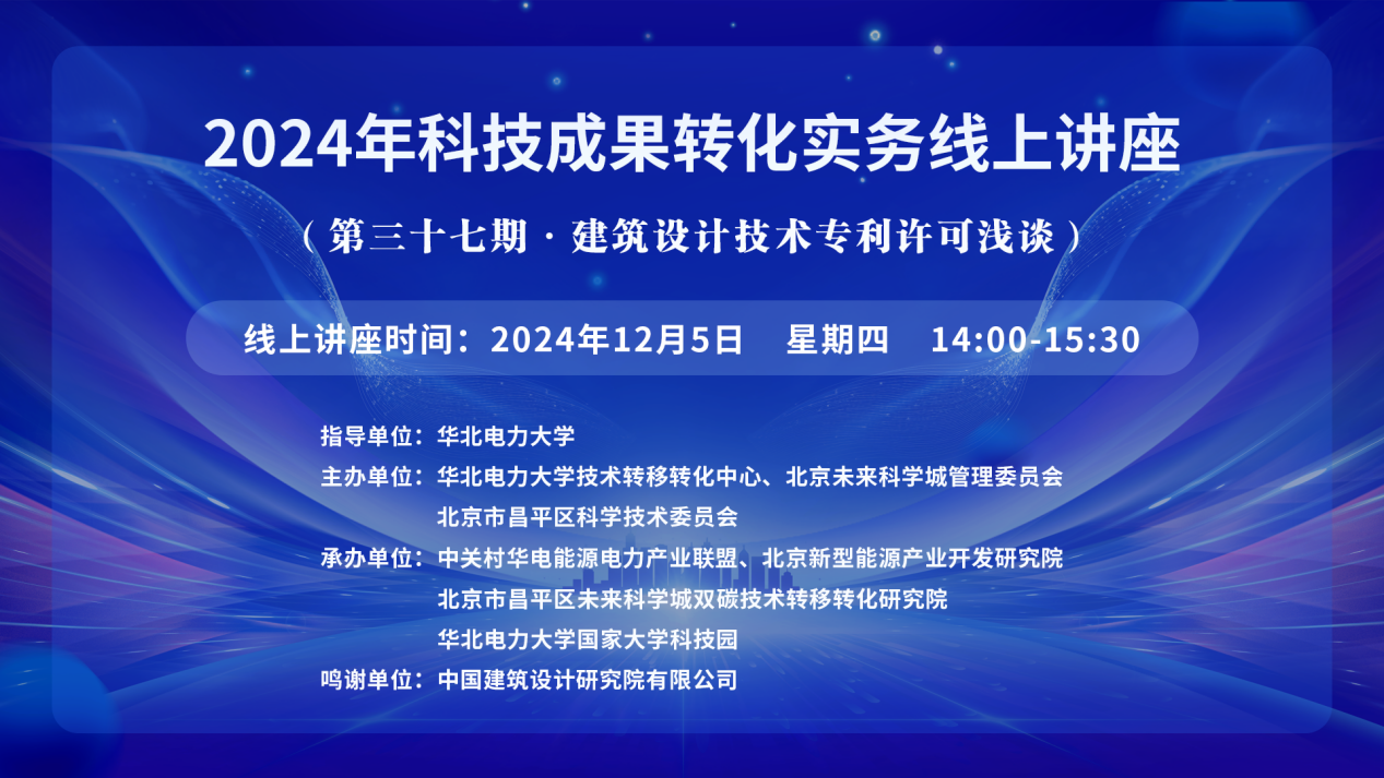 2024年科技成果转化实务线上讲座(第三十七期)【讲座主题】建筑设计技术专利许可浅谈 【讲座时间】12月05日 【讲座地点】https://wlwth.xetlk.com/sl/1pEEY7 联系人:李晓婉 13311276132 【主讲人】 王岩,中国建筑设计研究院有限公司科研与标准管理部副主任 【主讲人简介】 王岩,中国建筑设计研究院...主讲人:王岩时间:2024-12-05 16:28地点:线上讲座 -